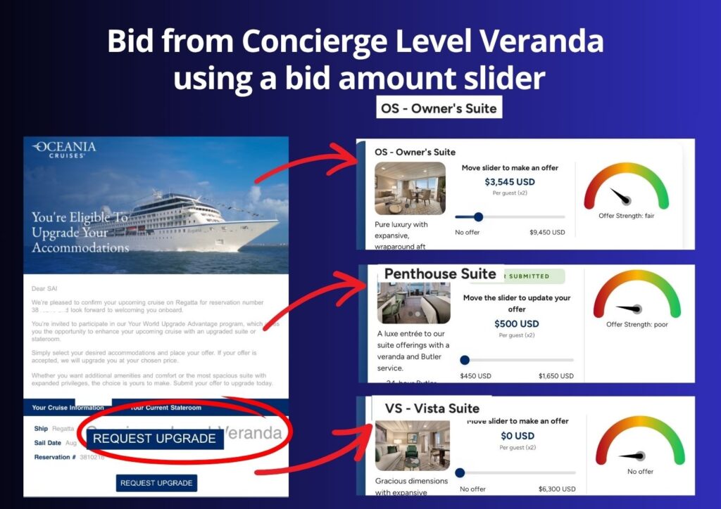 For example a guest in a Concierge Level Veranda cabin may receive an email offering the chance to bid on an upgrade to a Vista, Penthouse or Owner’s Suite.