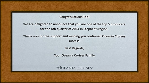 We are so honored to receive Oceania Cruises’ Top Producer Award, considered the jewel in our crown. This recognition reflects our dedication to creating unforgettable, personalized cruise experiences for every client.